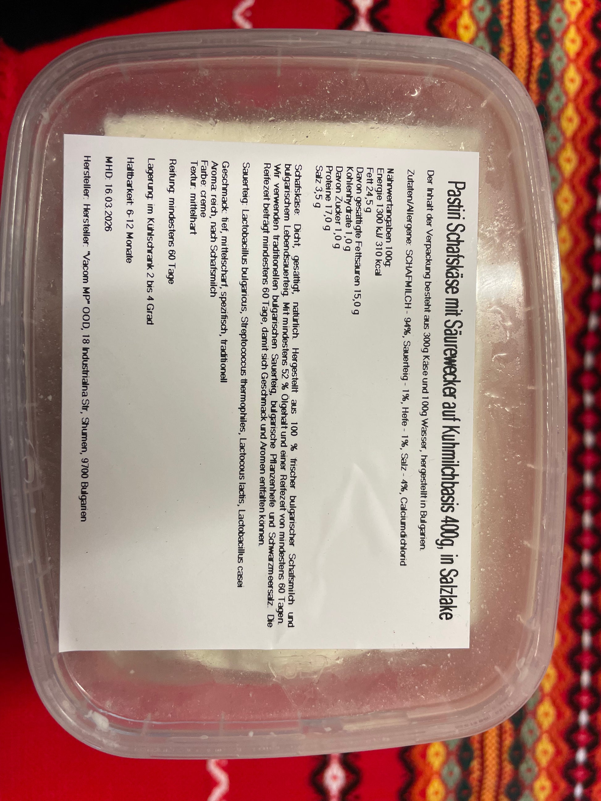 Schafskäse: Dicht, gesättigt, natürlich. Hergestellt aus 100 % frischer bulgarischer Schafsmilch und bulgarischem Lebendsauerteig. Mit mindestens 52 % Ölgehalt und einer Reifezeit von mindestens 60 Tagen. Wir verwenden traditionellen bulgarischen Sauerteig, bulgarische Pflanzenhefe und Schwarzmeersalz. Die Reifezeit beträgt mindestens 60 Tage, damit sich Geschmack und Aromen entfalten können.