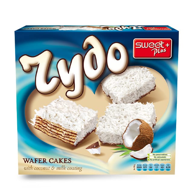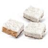 teilweise umhüllt von weißer Glasur mit Milchgeschmack (29%) und mit Kokosraspeln (8%) bestreut