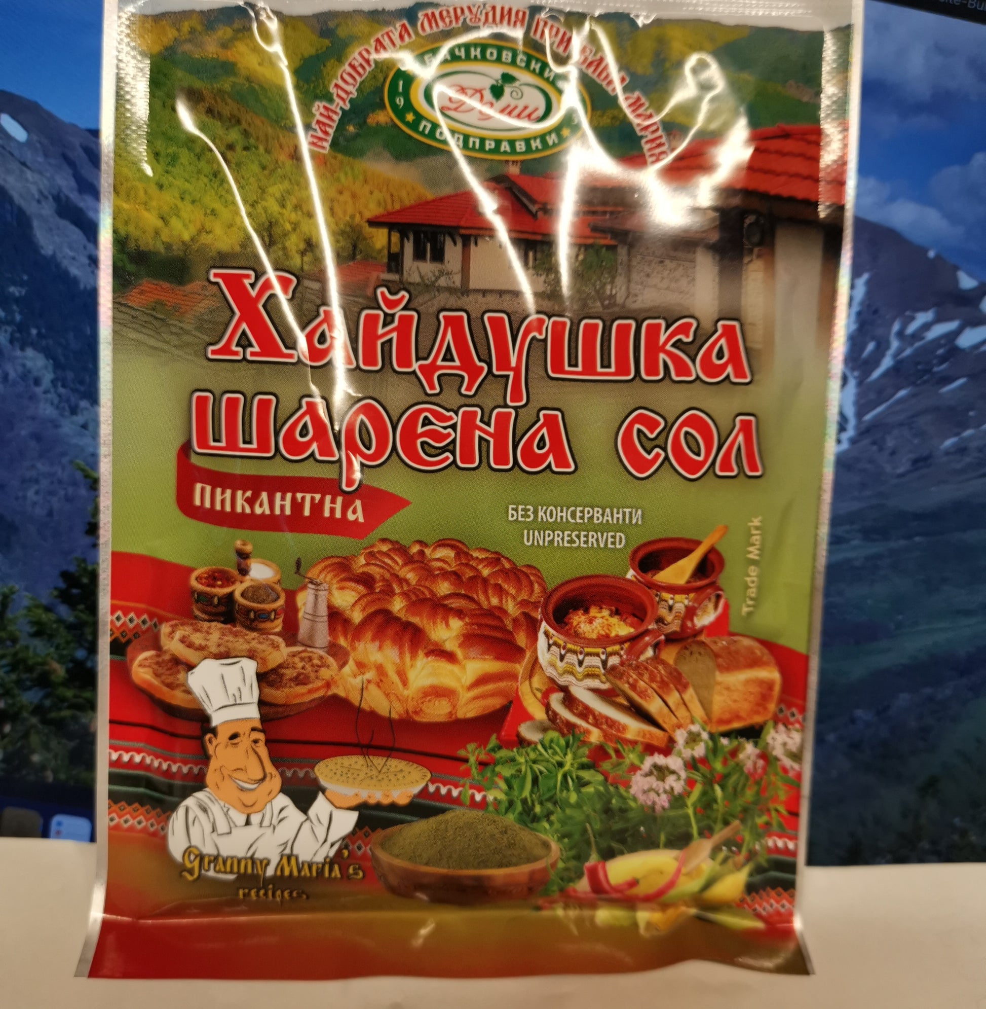 Haiduschka Scharena Salz 40 g/ Zutaten: Garten Tschubriza [Bohnenkraut},Savory Scharfes Rotepfeffer ,Salz ,Bockshornklee ,Geröstetes Maismehl. Hersteller DEMI -Elena Andreeva ; Stadt Asenovgrad. Herkunftsland Bulgarien